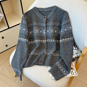 现货秋冬新款韩版设计感圆领套头复古提花撞色毛衣女针织衫开衫女
