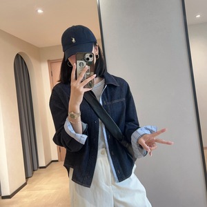 WTHEONE高品质拼接格纹小个子短款天丝翻领牛仔衬衫外套女2025秋