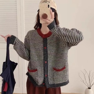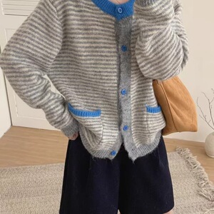 韩系设计感撞色条纹毛衣女2025秋季宽松百搭慵懒感针织开衫外套潮