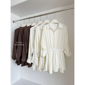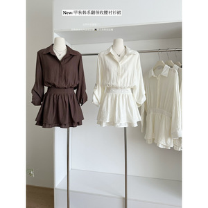 塞纳 褶皱A字收腰正肩翻领长袖短款连衣裙女秋微宽松休闲衬衫裙