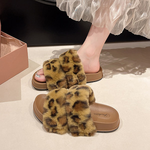 2025秋冬季网红豹纹时尚百搭毛毛拖鞋女外穿一字拖潮鞋厚底棉拖鞋