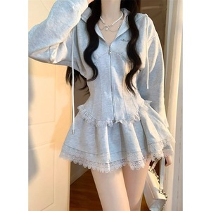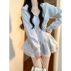 韩系甜美灰色蓬蓬短裙女秋季纯欲蕾丝花边收腰上衣卫衣半身裙套装