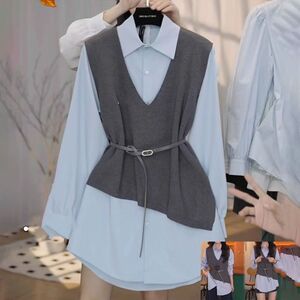 女装2025年春秋季时尚新款时尚收腰皮带拼接马甲长袖上衣两件套女