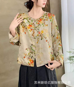 2025秋季新款新中式圆领衬衫女民族风复古盘扣人丝棉印花长袖开衫