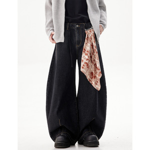 春秋新款复古黑色阔腿弯刀牛仔裤男美式设计感格子拼接百搭直筒裤
