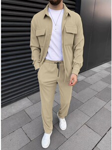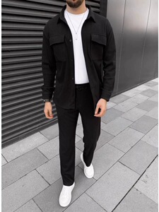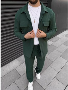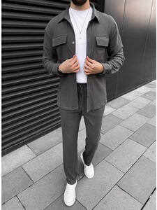 欧美跨境速卖通新款男士纯色灯芯绒长袖翻领衬衫长裤时尚休闲套装