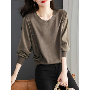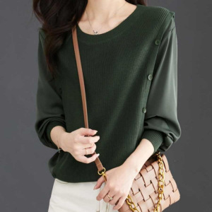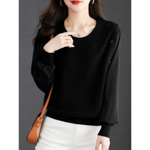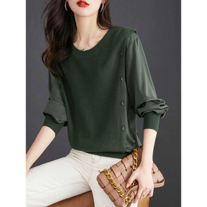 秋季假两件拼接针织衬衫圆领打底上衣