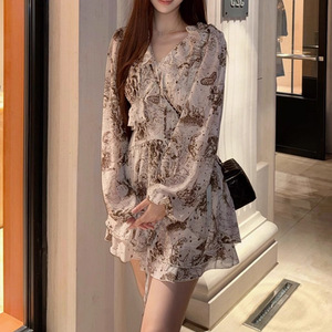 锦倩“多维茨画廊”复古浪漫V领荷叶边长袖短款层次连衣裙印花 潮