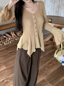 不规则镂空V领喇叭袖针织衫女2025秋季新款纯欲收腰修身显瘦上衣