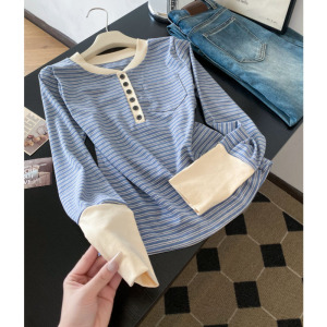 小个子独特超好看漂亮单穿上衣女早秋蓝色条纹假两件拼接长袖t恤