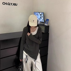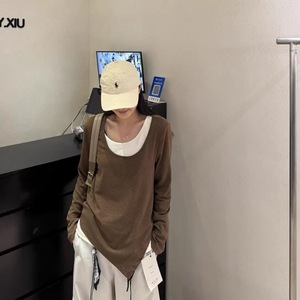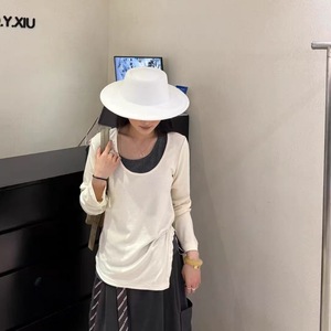 秋上新圆领拼接不规则软糯假两件打底小衫55791