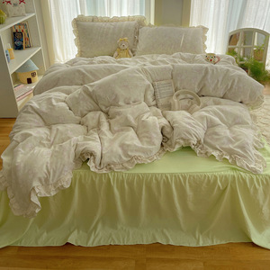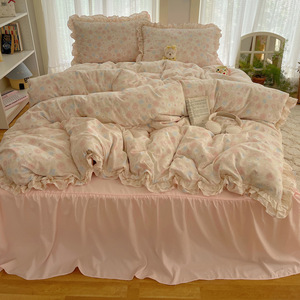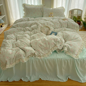 A类新款双层花边床单床裙碎花水洗棉四件套法式被套公主风三件套