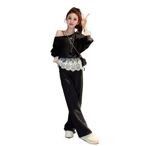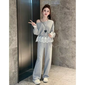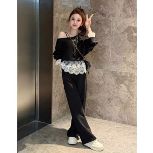 欧货减龄时尚休闲套装女春季高级感蕾丝边露肩卫衣阔腿长裤两件套