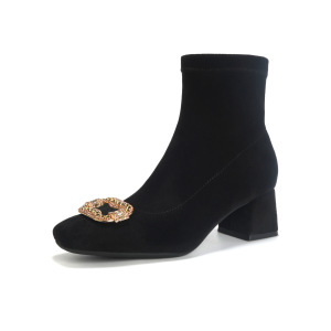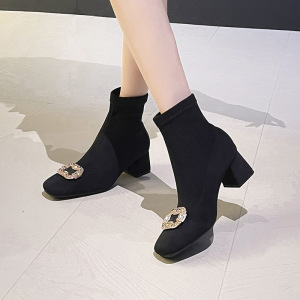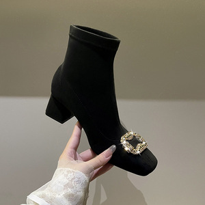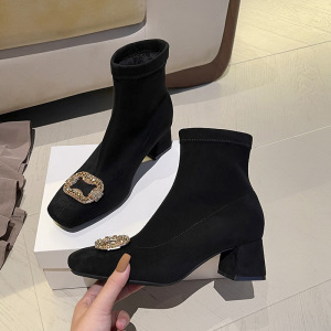绒面水钻方扣高跟弹力靴韩版瘦瘦靴粗跟方头短靴靴子女秋冬季单靴