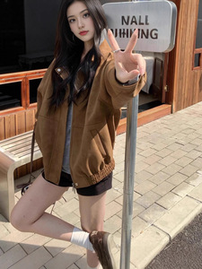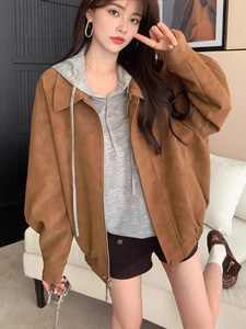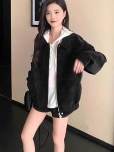 美拉德复古宽松翻领休闲百搭显瘦皮绒夹克女秋季休闲机车外套上衣