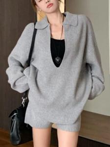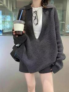 慵懒松弛v领女式毛衣套装2025秋冬新款宽松显瘦针织衫短裤两件套