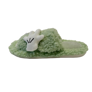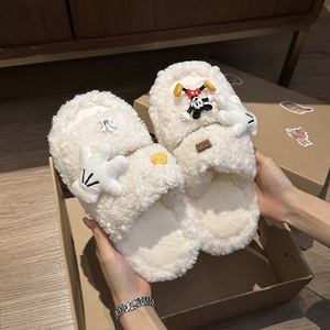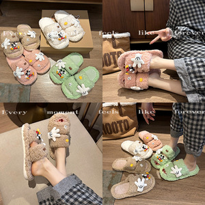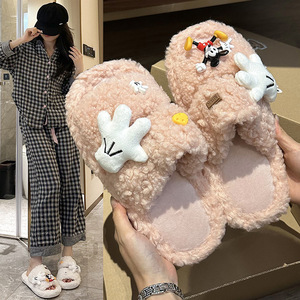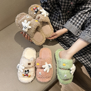 卡通米奇露趾毛毛拖鞋冬季家居舒适软底一字拖外穿防滑情侣棉拖
