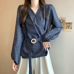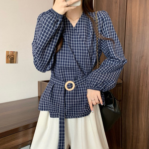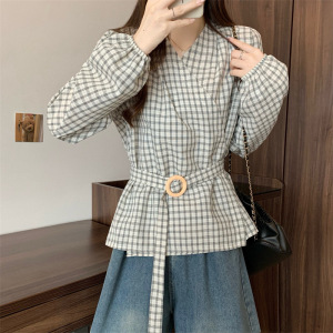 糖糖~新版韩风格子早秋法式收腰衬衫上衣