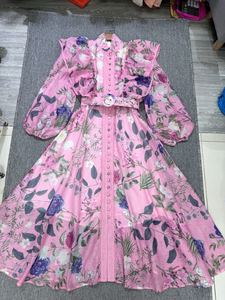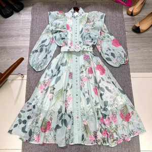 2025早秋新款立领花边系带欧美复古宫廷风荷叶花边印花连衣裙女
