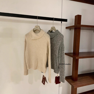 WGWE7198小吸睛设计感翻领毛衣坑条宽松韩系慵懒针织毛衣