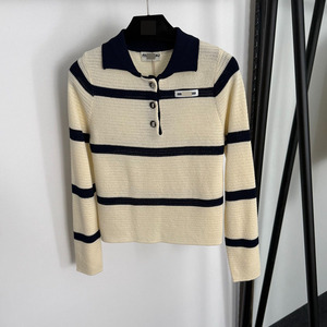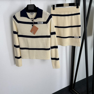 深圳南油货高端跨境热销翻领长袖条纹针织衫上衣+条纹针织短半裙