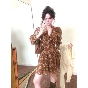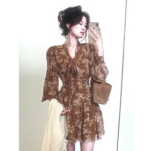 法式复古碎花绑带v领连衣裙早秋季新款修身收腰显瘦短款不规则裙