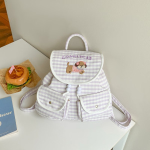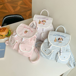 日系可爱格子少女出游背包新款卡通腊肠狗刺绣ins风韩系双肩包潮