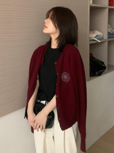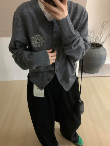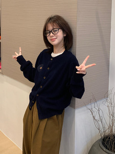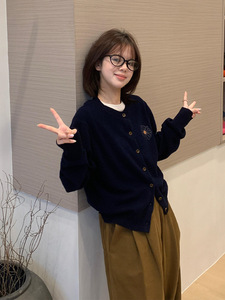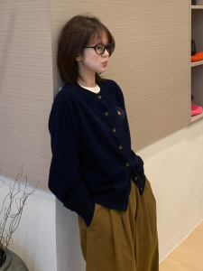 早秋慵懒风穿搭藏蓝色毛衣开衫外套女春秋款小个子外搭针织衫上衣