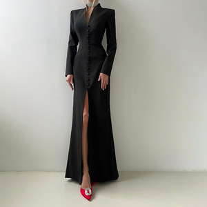 欧美风2025秋季跨境新款时尚气质优雅纯色低胸V领开叉高腰连衣裙