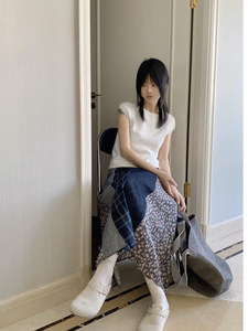 日系流浪风拼接格子半裙女春秋开叉设计感牛仔A字碎花半身中长裙