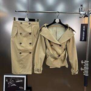 翻领双排扣风衣外套+高腰显瘦半身裙两件套套装