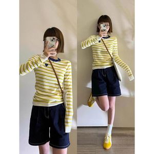 撞色条纹修身黄色条纹针织衫女春秋小众复古撞色圆领打底长袖上衣