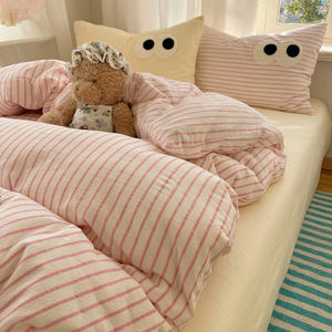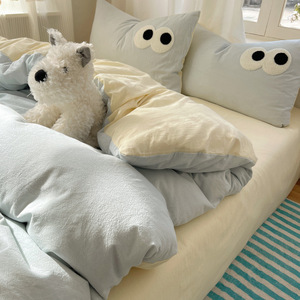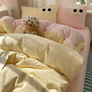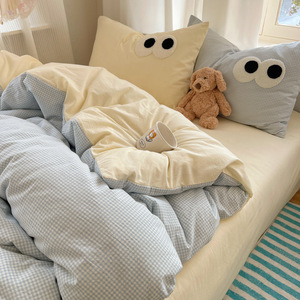 A类母婴级软糯床品云柔纯水洗棉大眼睛毛巾绣混搭格子撞色四件套1