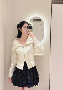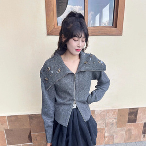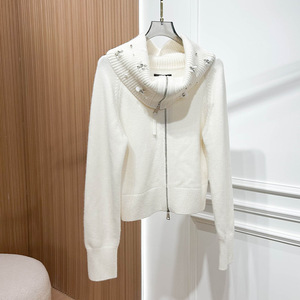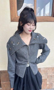 2025秋冬季新学院风拉链款钉珠披肩领重工气质优雅针织开衫外套女