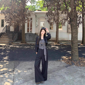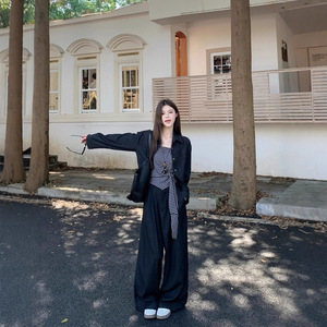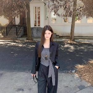 2025秋季新款韩系设计长袖开衫格子背心吊带阔腿休闲裤时尚套装女