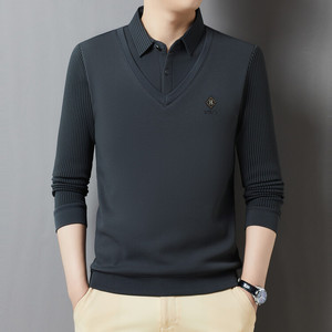 跨境直播加绒加厚假两件长袖polo衫男式冬季中年爸爸装打底衫T恤