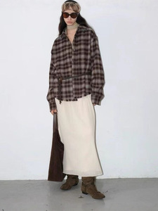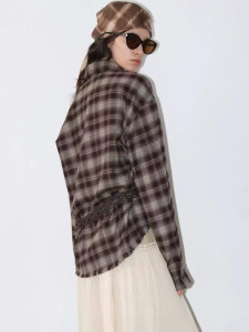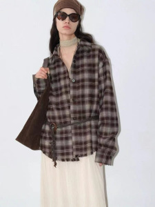 016新款复古慵懒咖色毛边衬衣格子百搭廓形版