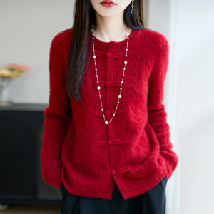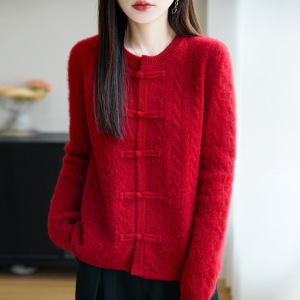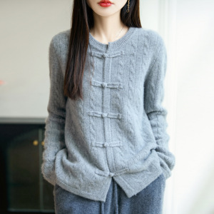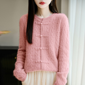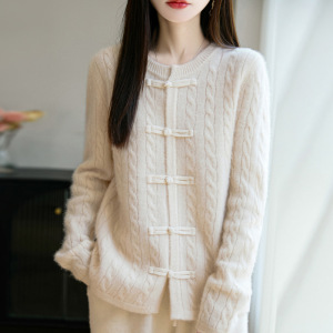 100%纯羊毛2025秋冬新款女新中式圆领盘扣绞花宽松加厚针织衫毛衣