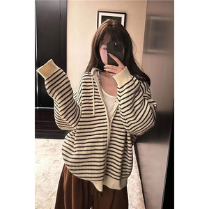 复古慵懒风条纹连帽毛衣外套女秋冬款软糯宽松拉链针织开衫