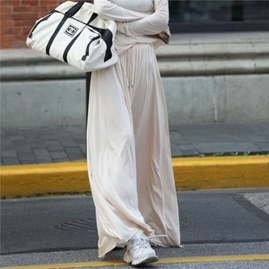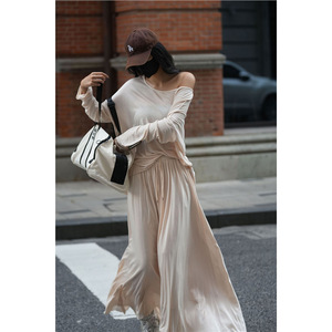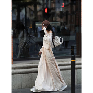 简约杏色两件套装女秋季长袖露肩T恤上衣高腰休闲百褶半身裙子