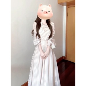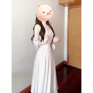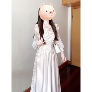 法式复古条纹长袖连衣裙子女早秋季2025新款今年流行海边度假长裙