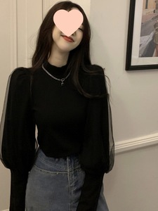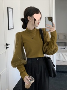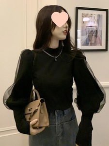 黑色半高领打底衫女早秋季新款法式别致内搭泡泡袖设计感上衣