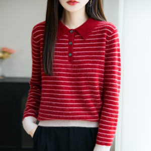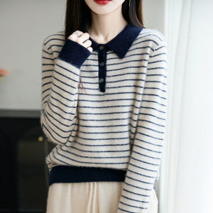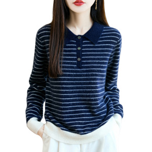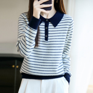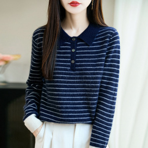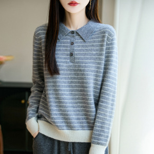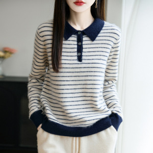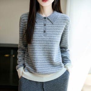 100%纯羊毛2025秋冬新款女式宽松Polo领拼色条纹打底针织衫毛衣