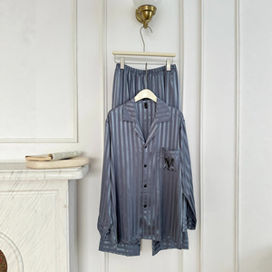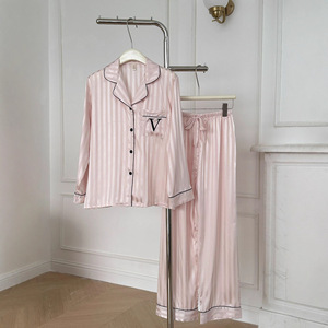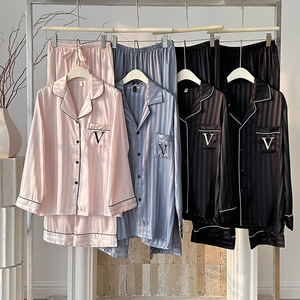 跨境冰丝睡衣女秋季轻奢高级感条纹长袖长裤翻领家居服缎子两件套