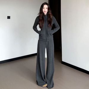 时尚休闲套装长袖条纹外套上衣女春秋高腰宽松阔腿裤拖地裤两件套