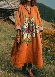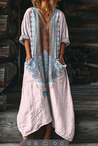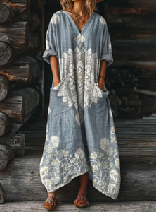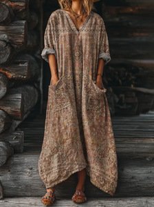 2025新款独立站女式复古花卉艺术图案印花口袋V领口袋连衣裙2