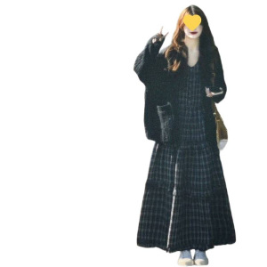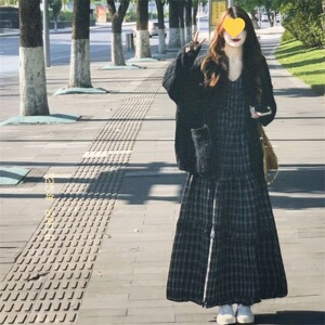 2025秋季新款一整套穿搭宽松格纹高腰连衣裙女+黑色针织开衫毛衣