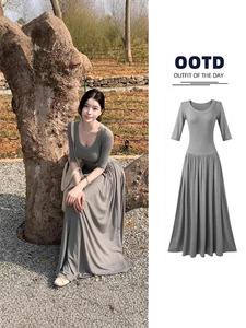 2025新款御姐高级感灰色短袖连衣裙子女秋韩系慵懒风休闲收腰长裙