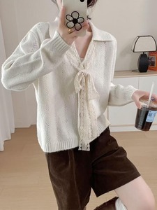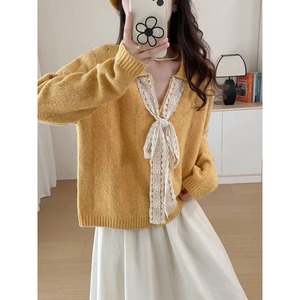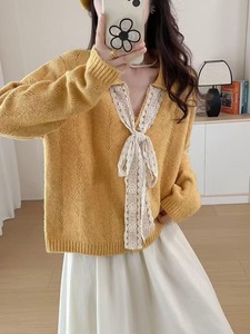 法式V领蝴蝶结系带黄色翻领毛衣女秋冬韩系穿搭慵懒风针织衫上衣