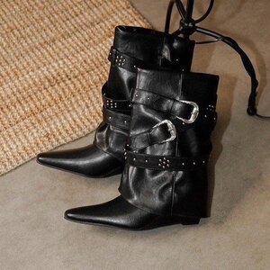 法式风~复古内增高绒面百搭瘦瘦靴女方头简约气质骑士靴秋冬新款